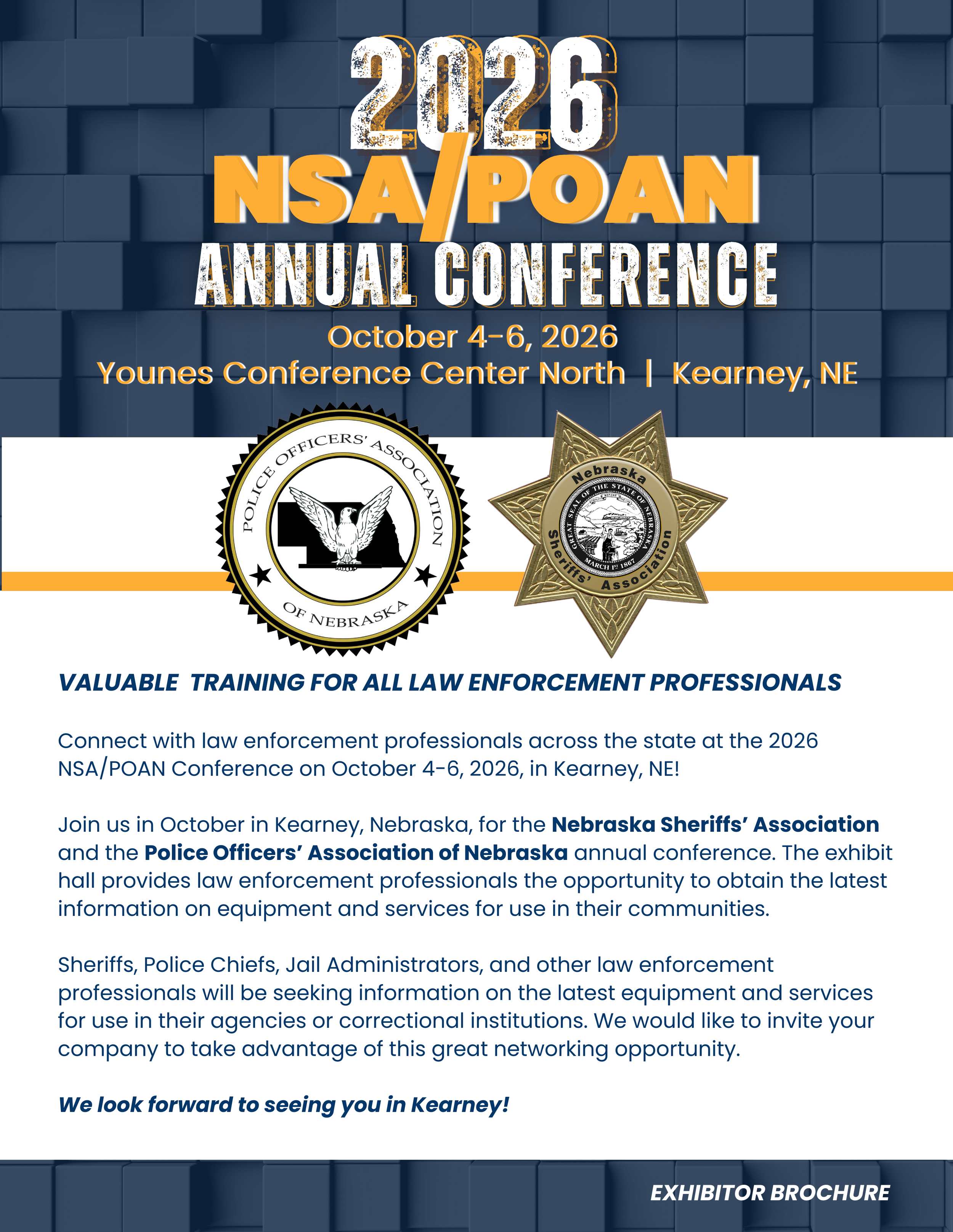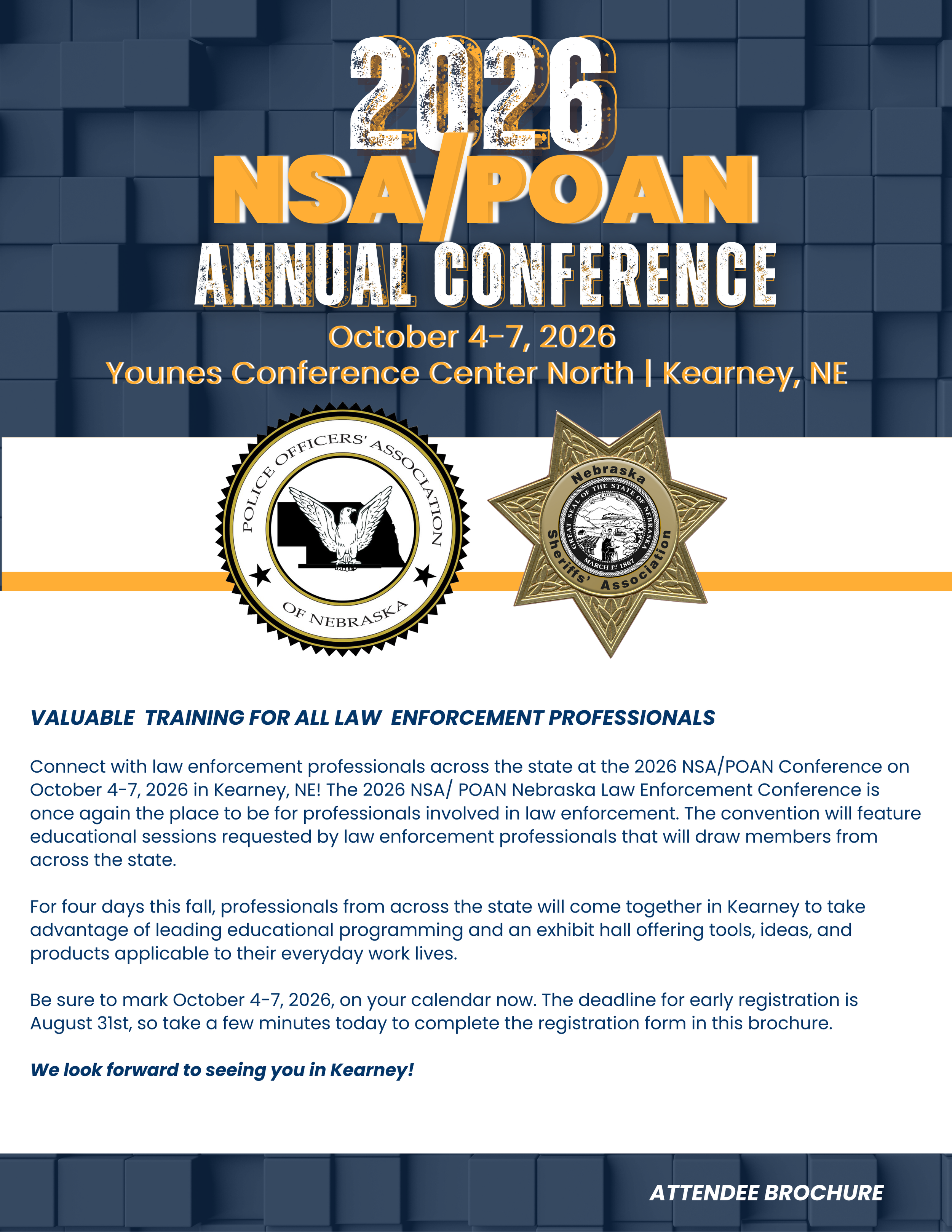 Join law enforcement professionals at the 2026 NSA/POAN Conference, October 4-7, in Kearney, NE, at Younes Conference Center - North.